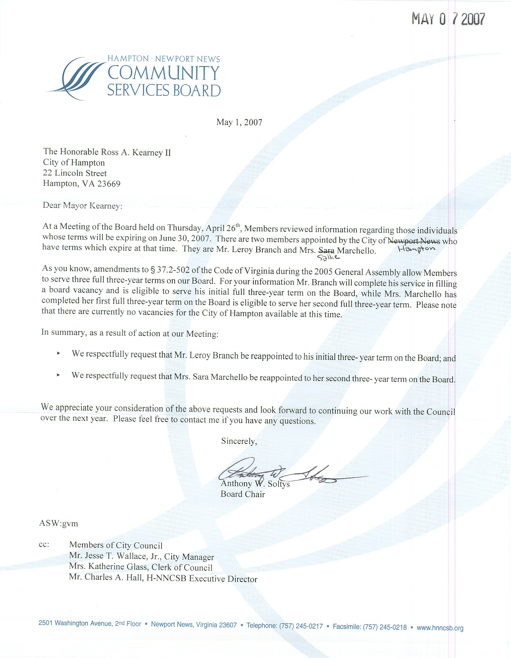 to consider appointments to the Hampton-Newport News Community Services Board.